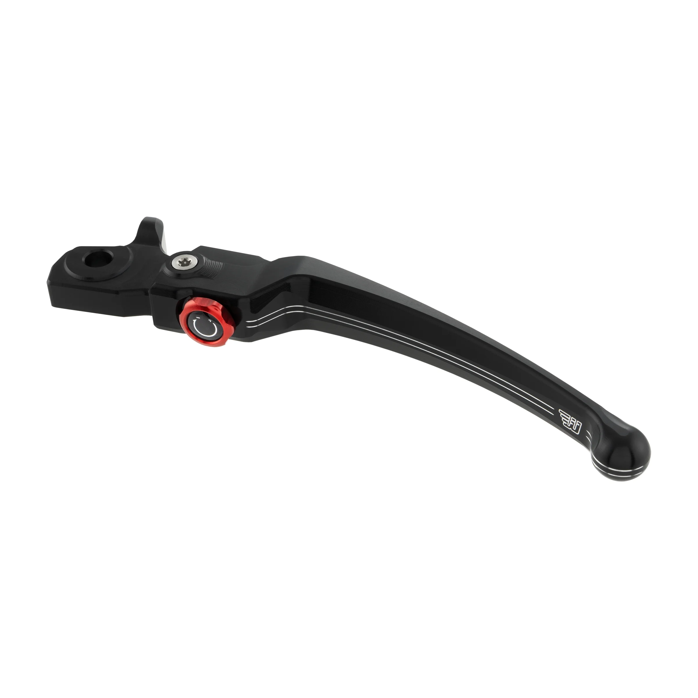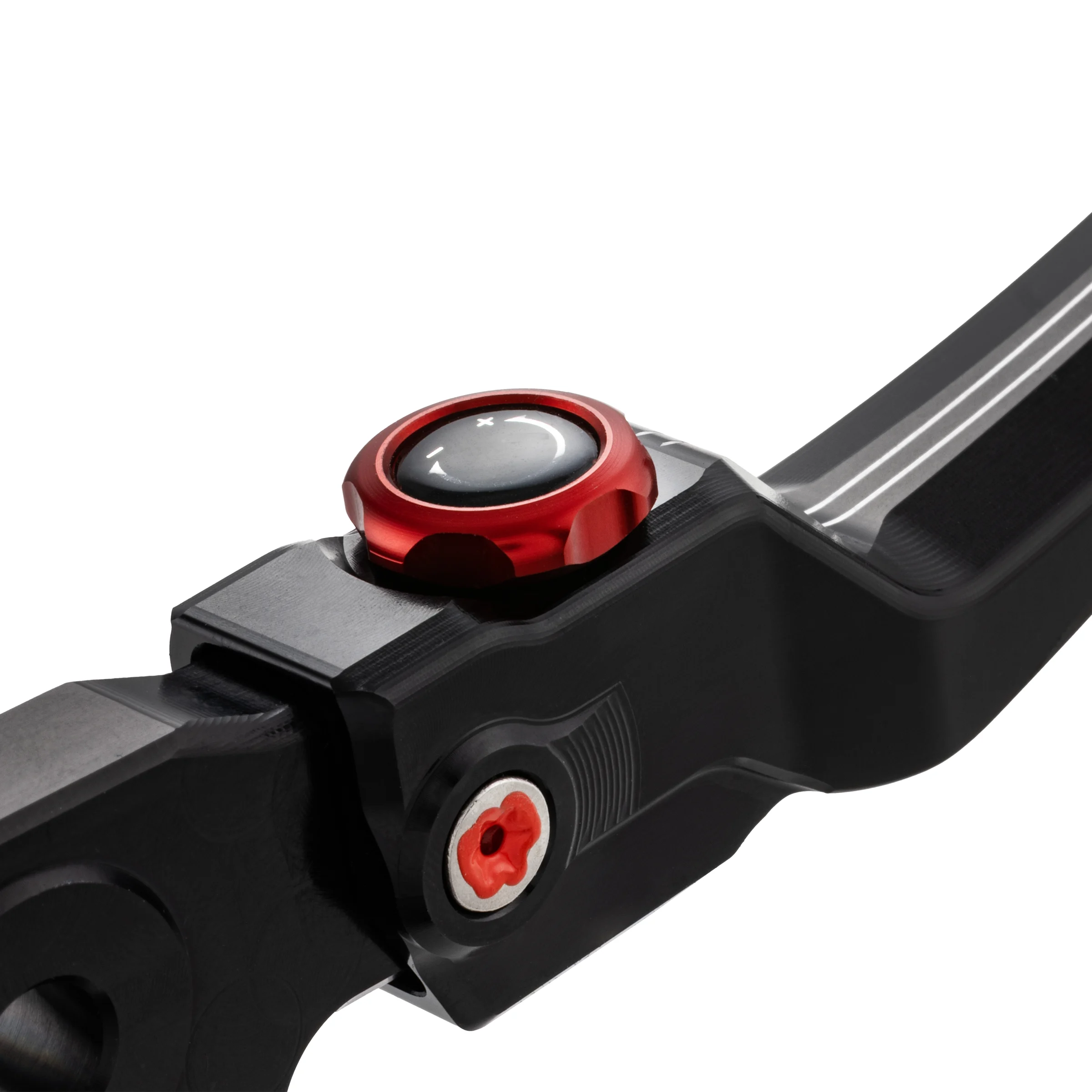 La largeur de la poignée est réglable en continu pour une ergonomie optimale. La distance du levier peut être réglée plus près du guidon qu’avec les leviers Vespa d’origine, ce qui peut améliorer le contrôle et le confort lors du freinage. Le mécanisme de réglage est discrètement intégré.